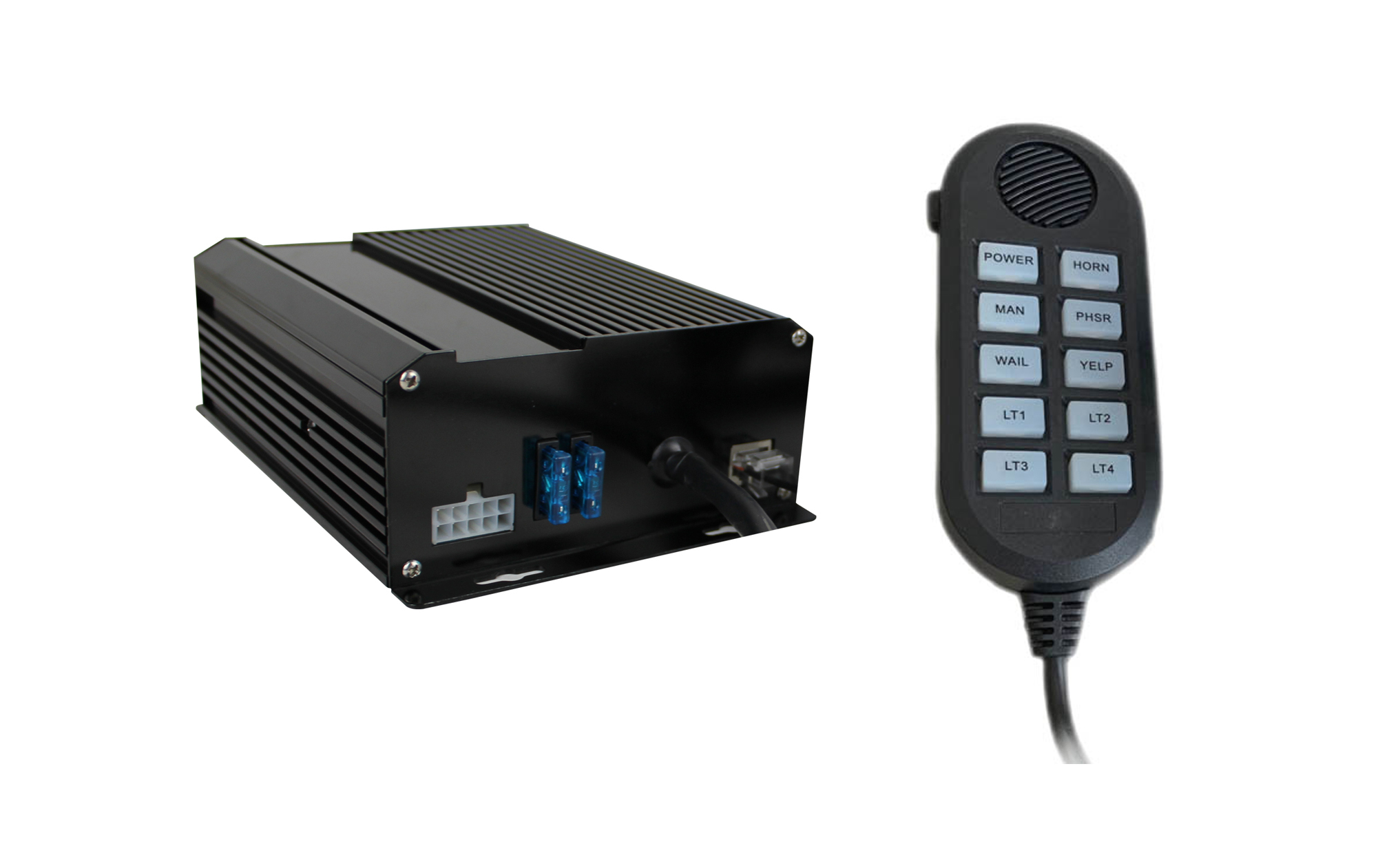 Unit featuring: one siren includes one or two handheld controllers, tones including horn,manual,power,stop,mech,wail,yelp,phaser, also with Light1,Light2 control switches